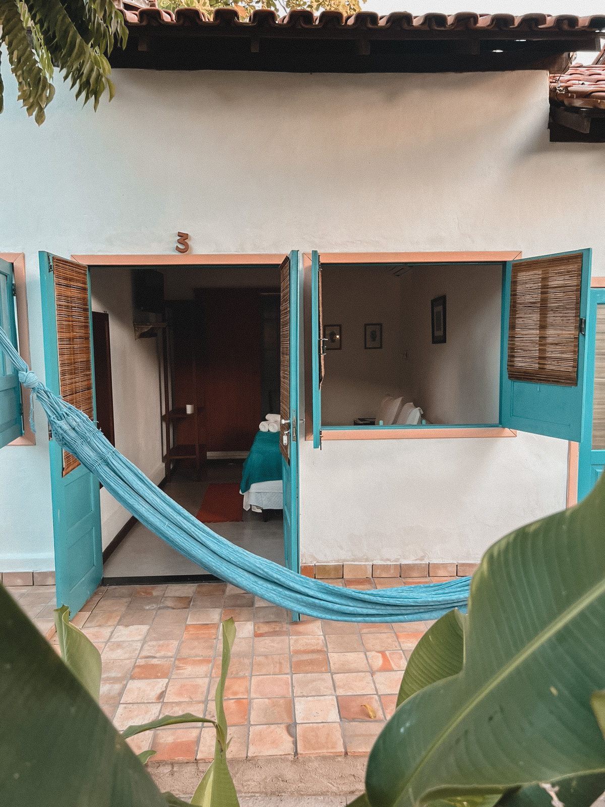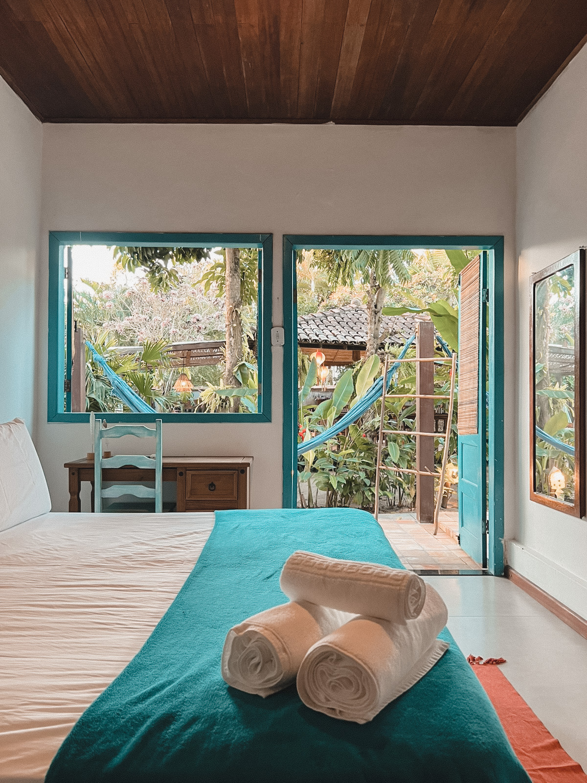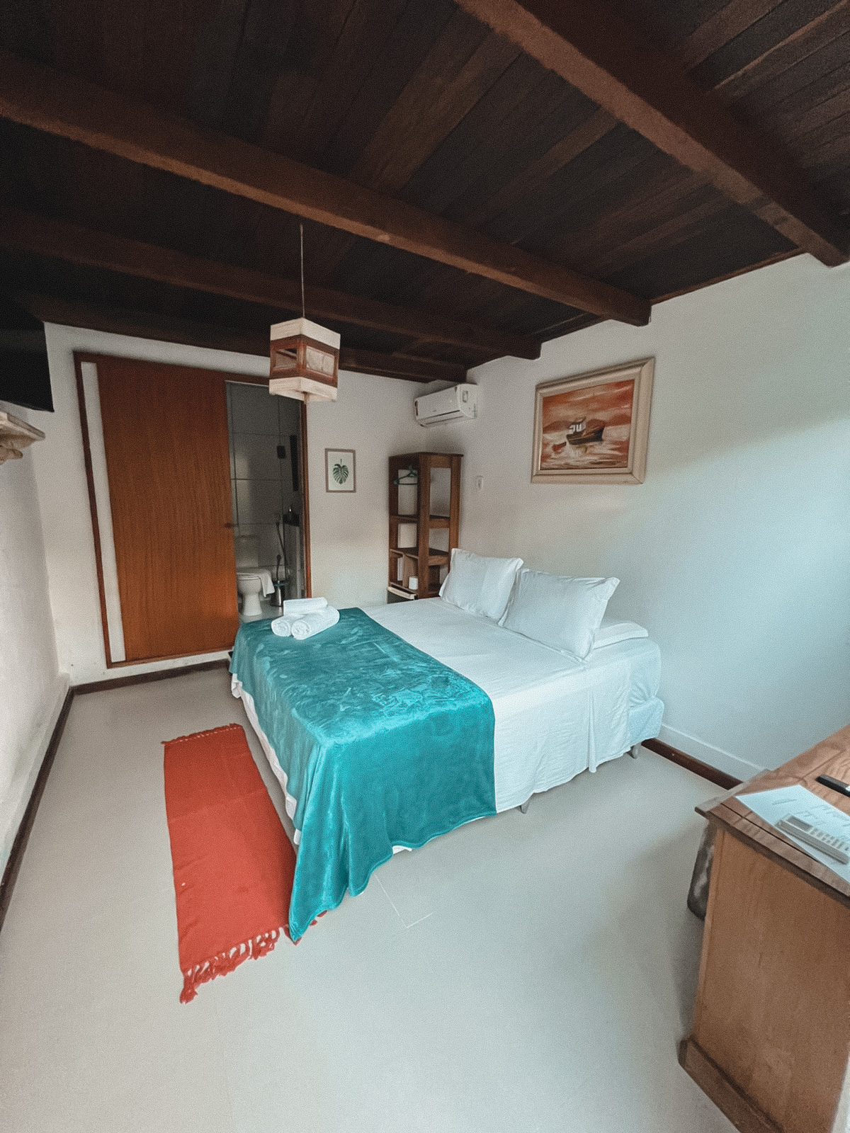 Para quem busca hospedagem simples e confortável. Algumas características diferencias dela são a cama queen, a varanda com vista para ceú lindo de Caraíva e com vista para o jardim da própriedade. Com decoração minimalista, objetivos feitos aqui na pousada e alguns de artesãs locais. Está suíte é propícia a momentos românticos ao ar livre. Reformada em 2015 e área total de 20 m² incluindo a varanda. A Suíte é equipada com: