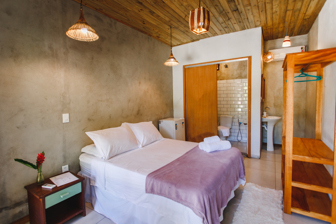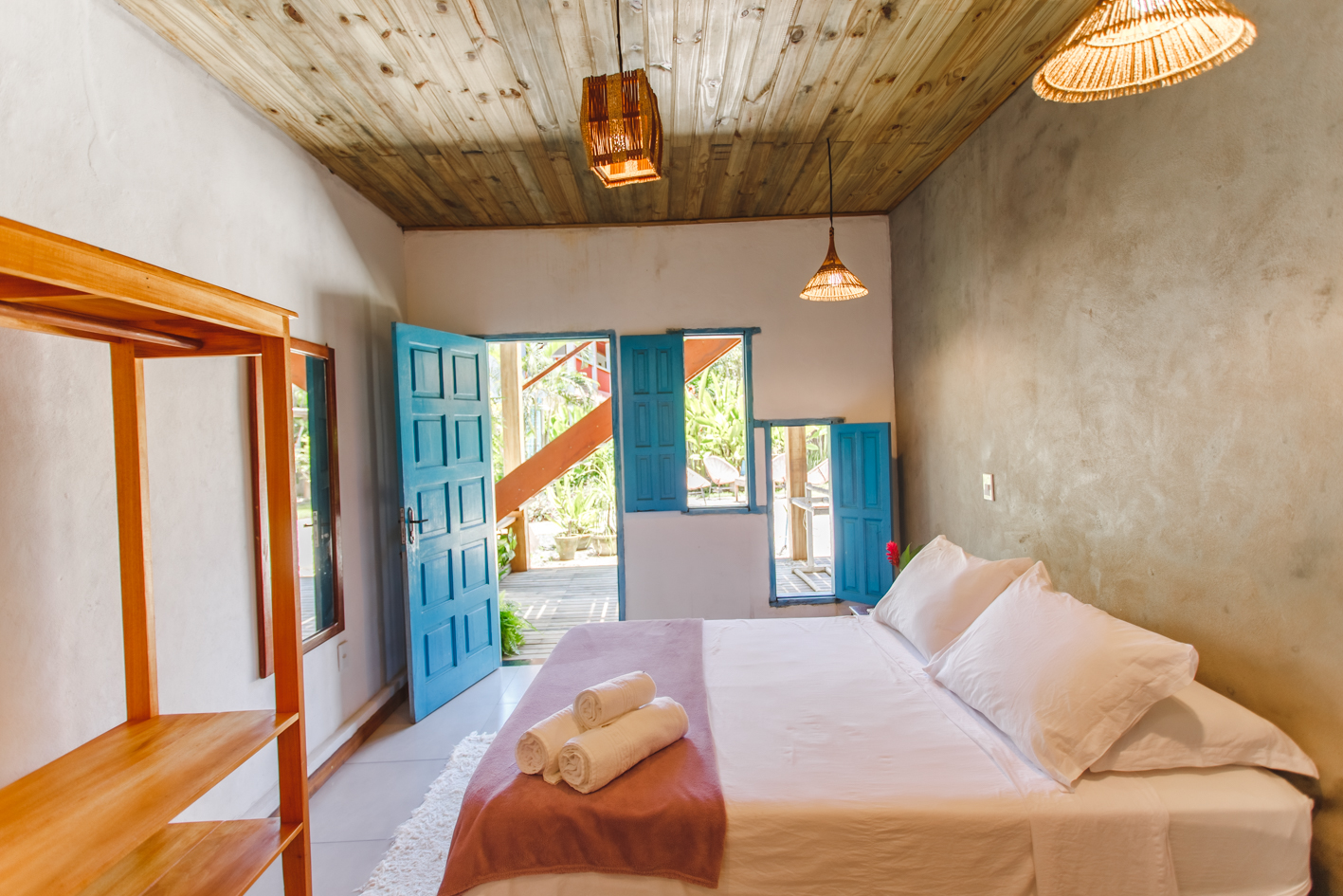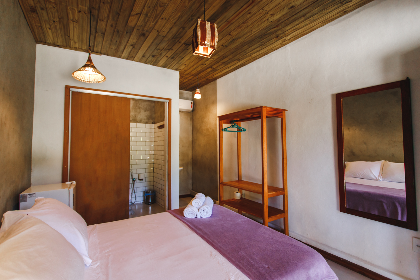 É uma suíte com cama de casal, ar condicionado e frigobar. Devido ser uma construção antiga e não podendo ter laje em Caraíva no plano diretor antigo, esta suíte tem um teto de assoalho de madeira que poderá ouvir os passos da suíte superior.