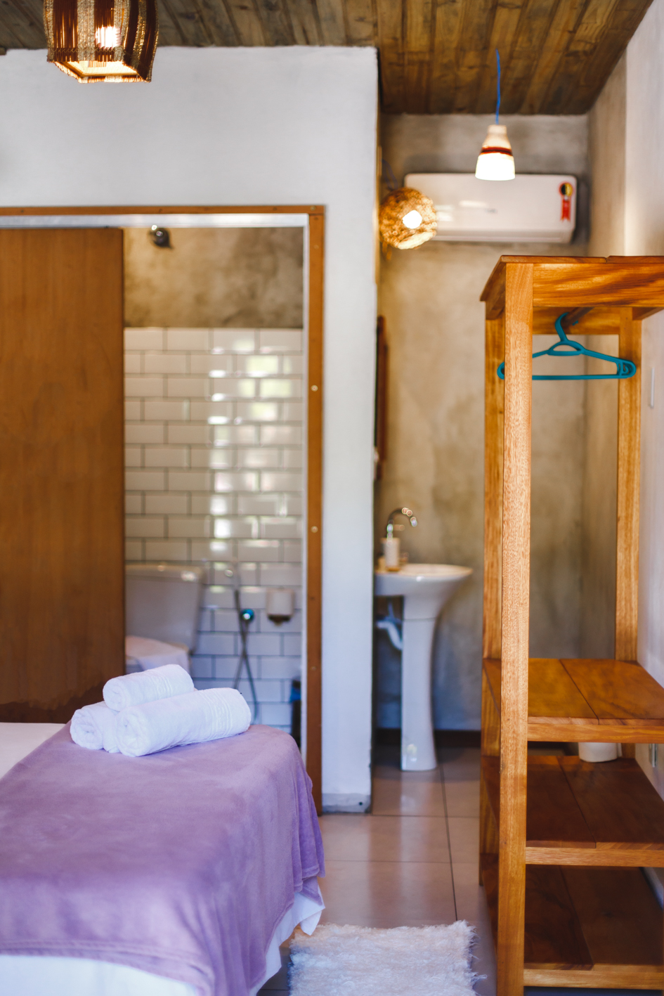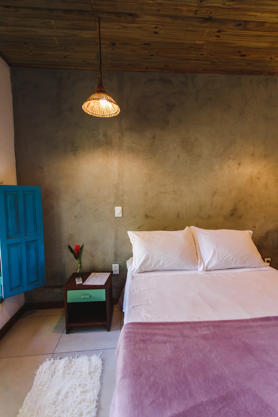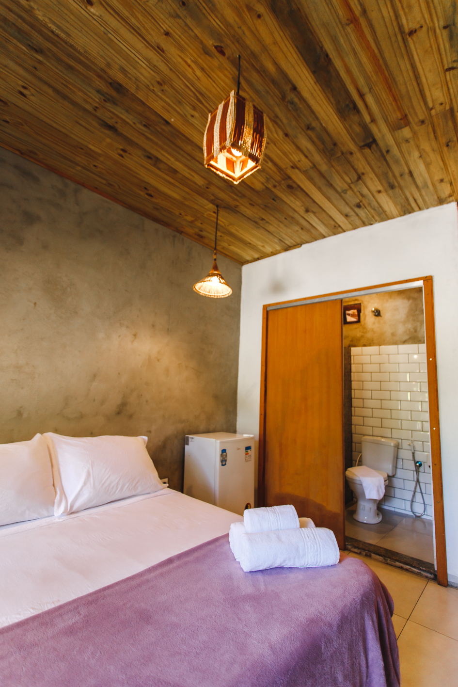 É uma suíte com cama de casal, ar condicionado e frigobar. Devido ser uma construção antiga e não podendo ter laje em Caraíva no plano diretor antigo, esta suíte tem um teto de assoalho de madeira que poderá ouvir os passos da suíte superior.
